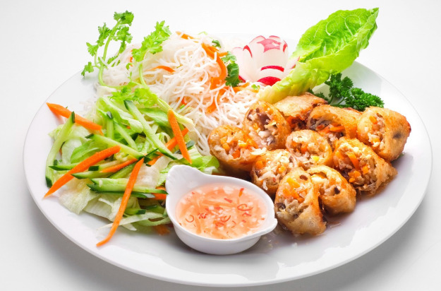 Leckere hausgemachte Frühlingsrollen, serviert mit Reisnudeln,